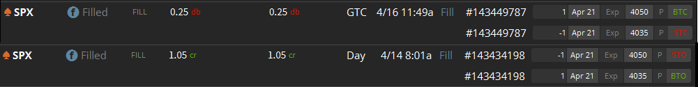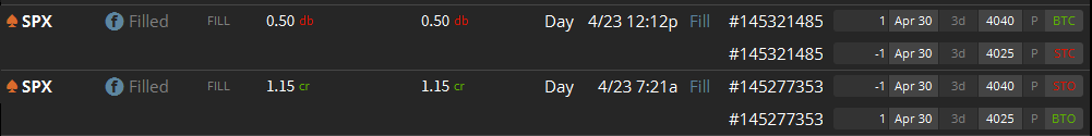 This trade above was put on in the early A.M. on Friday April 23rd with the intent of it being a typical 7 DTE play. However, markets were significantly in our favor and volatility came out so much that I was able to day trade out of this at the end of the day for a nice 56.52% gain in just a matter of hours!